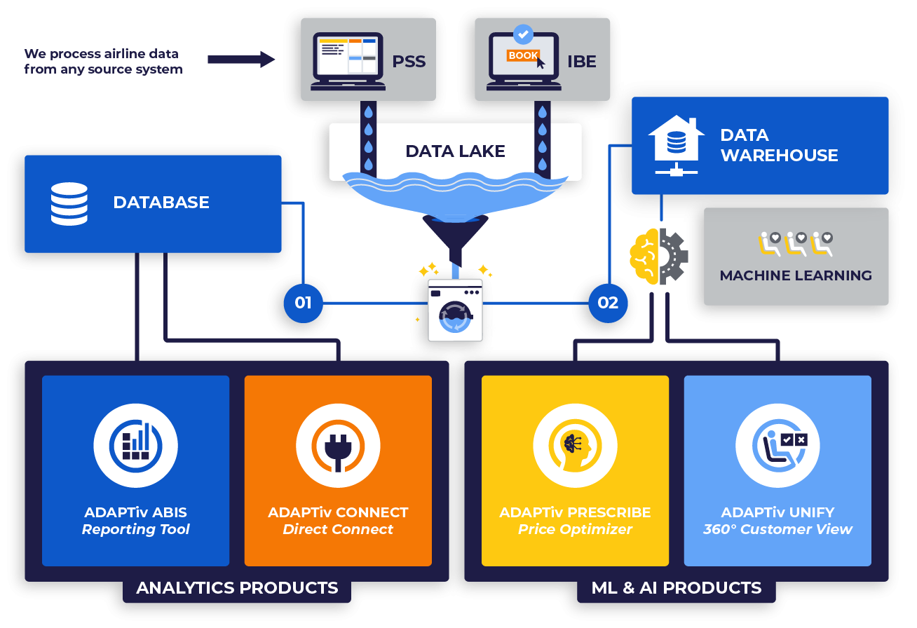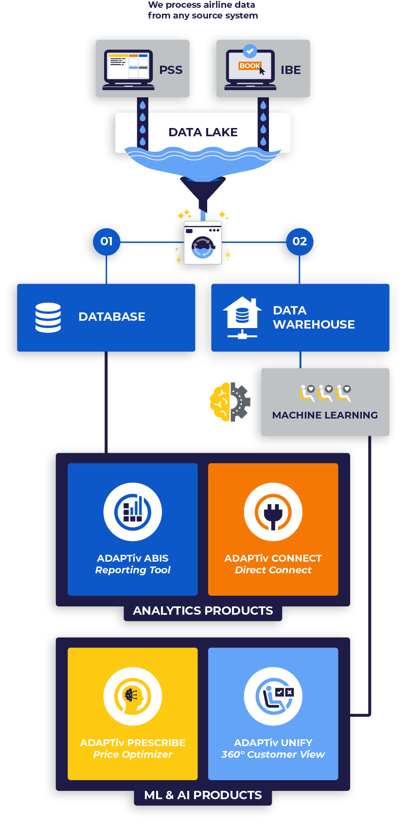 The ADAPTiv platform integrates with any data source to unlock real-time airline data, including passenger data, from any PSS (including Amadeus, Sabre, and Navitaire).